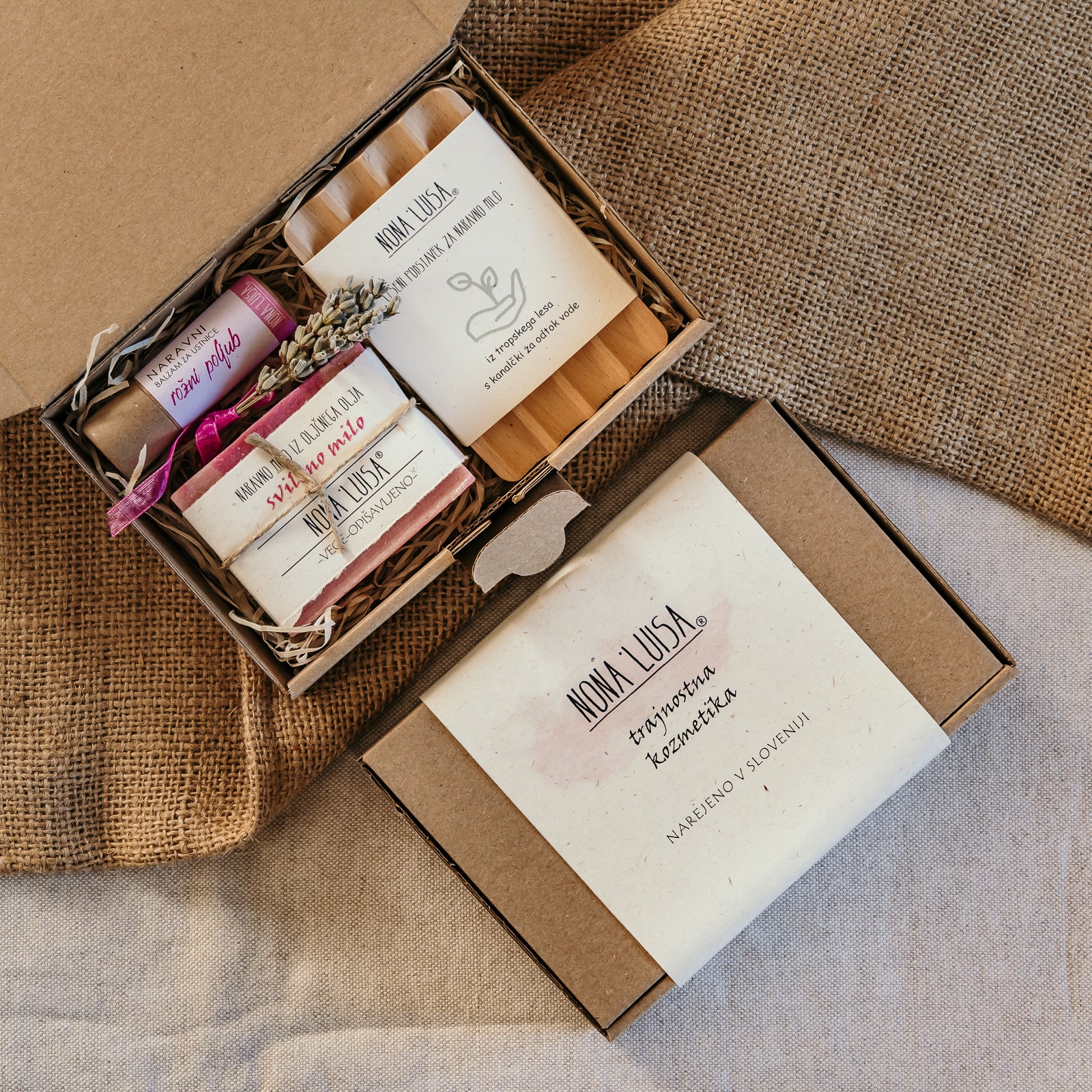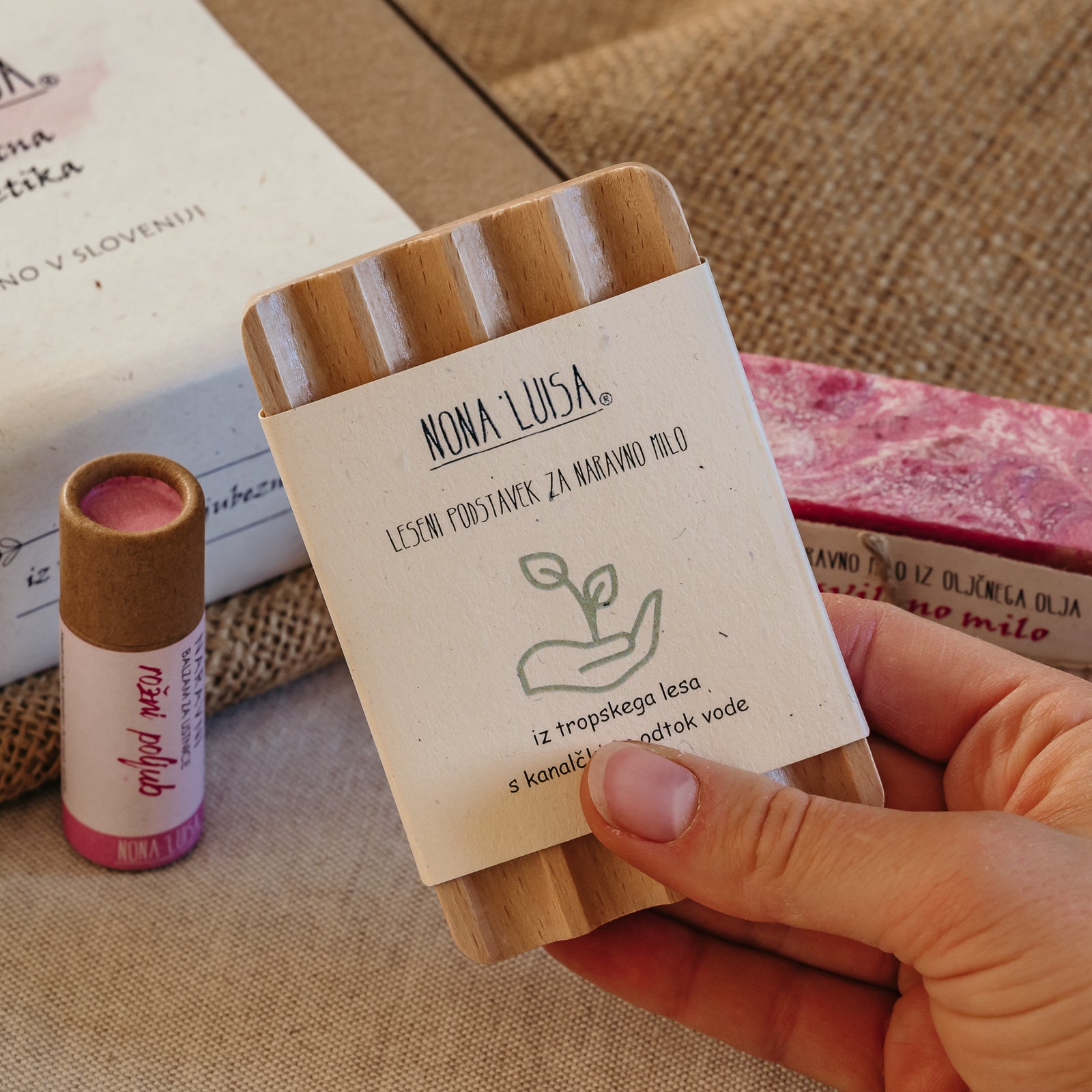 V vsakem darilnem setu prejmete tudi leseni podstavek za milo, ki omogoča odtekanje vode, podaljša življenjsko dobo mila in doda estetski, trajnostni pridih vašemu kopalniškemu kotičku.