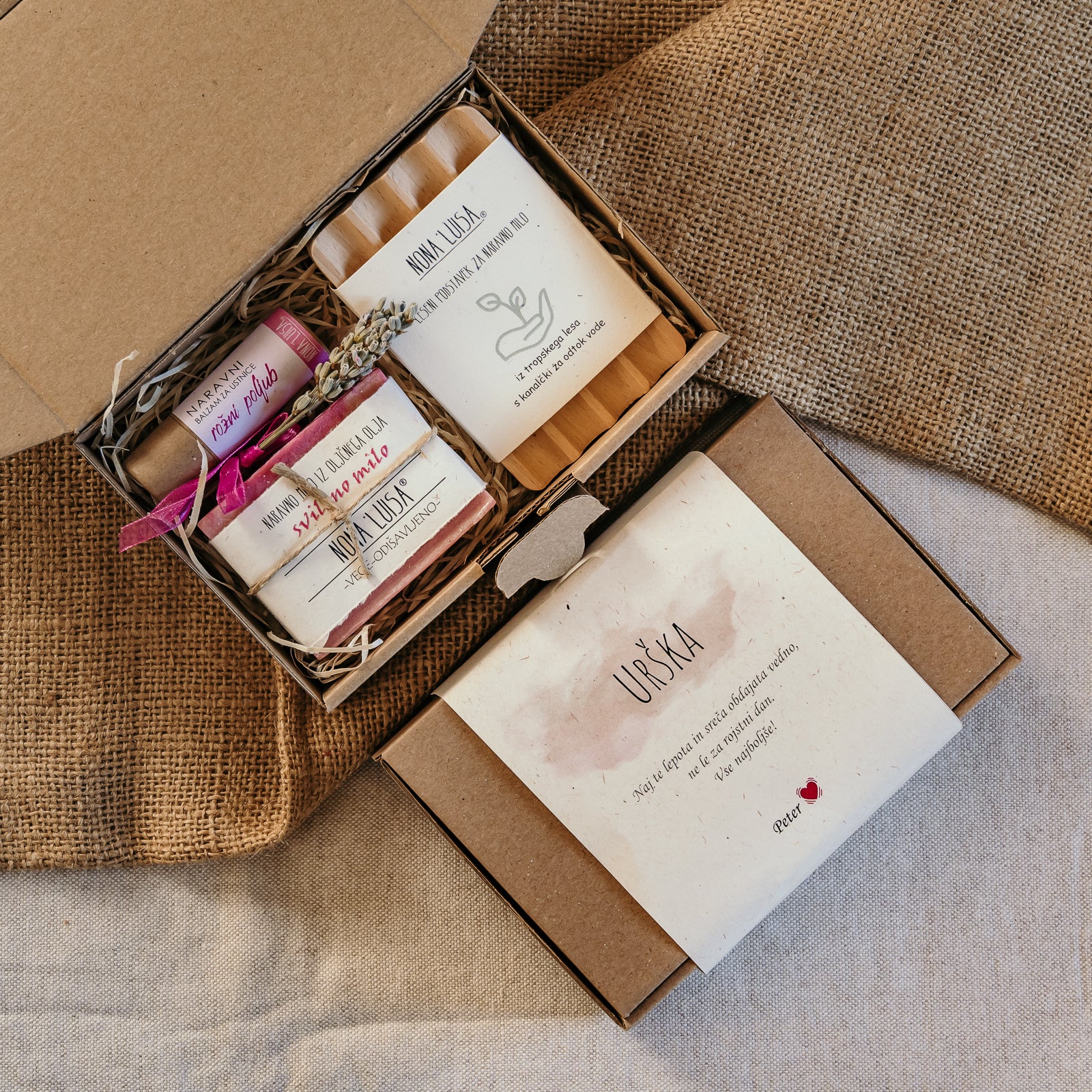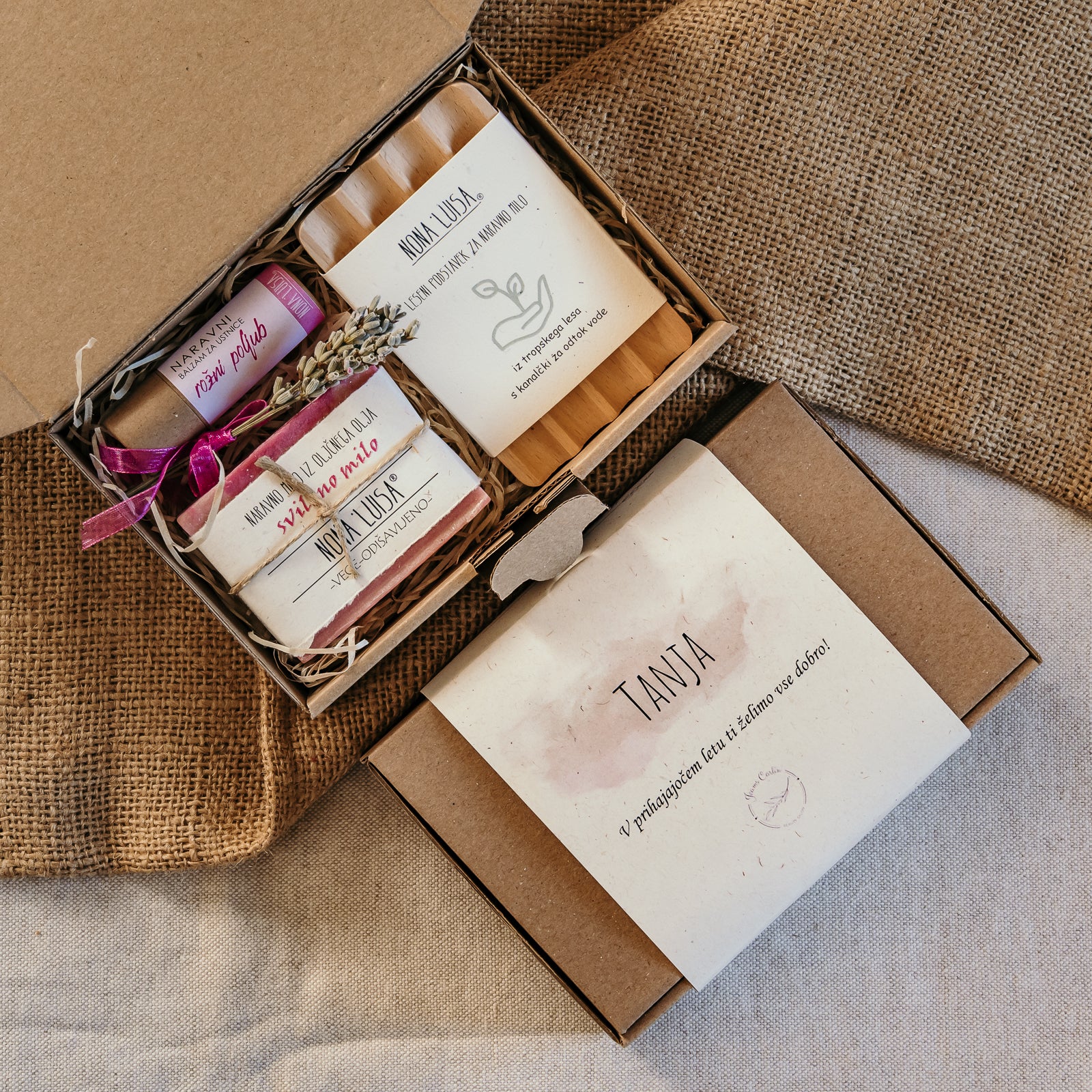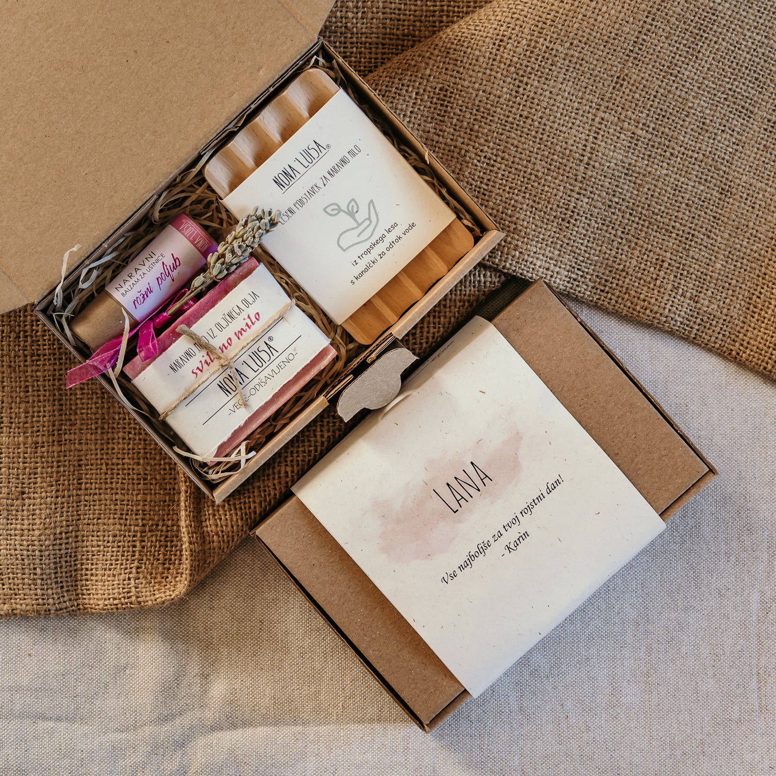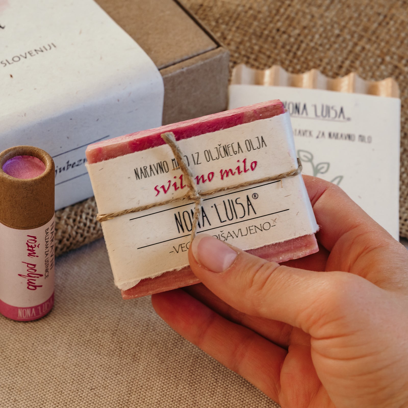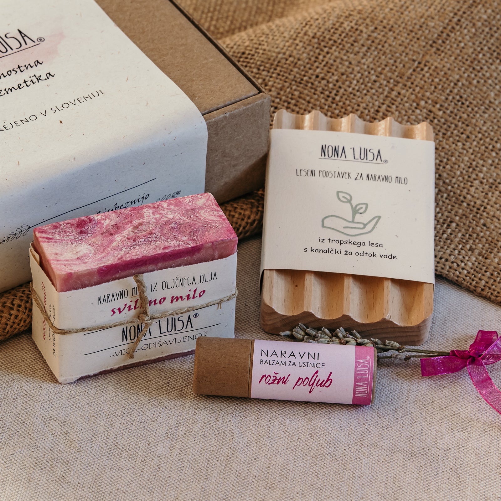 Personalizirano naravno darilo z vrtnico: milo, leseni podstavek in balzam za ustnice