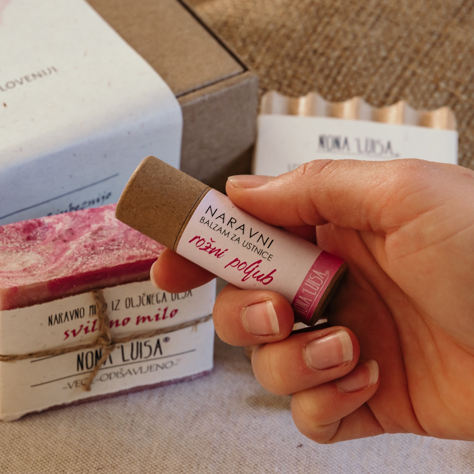 • Naravni balzam za ustnice – Rožni poljub (11 ml) – Za nežno nego suhih in razpokanih ustnic. Globinsko navlaži, mehča in ščiti pred zunanjimi vplivi.